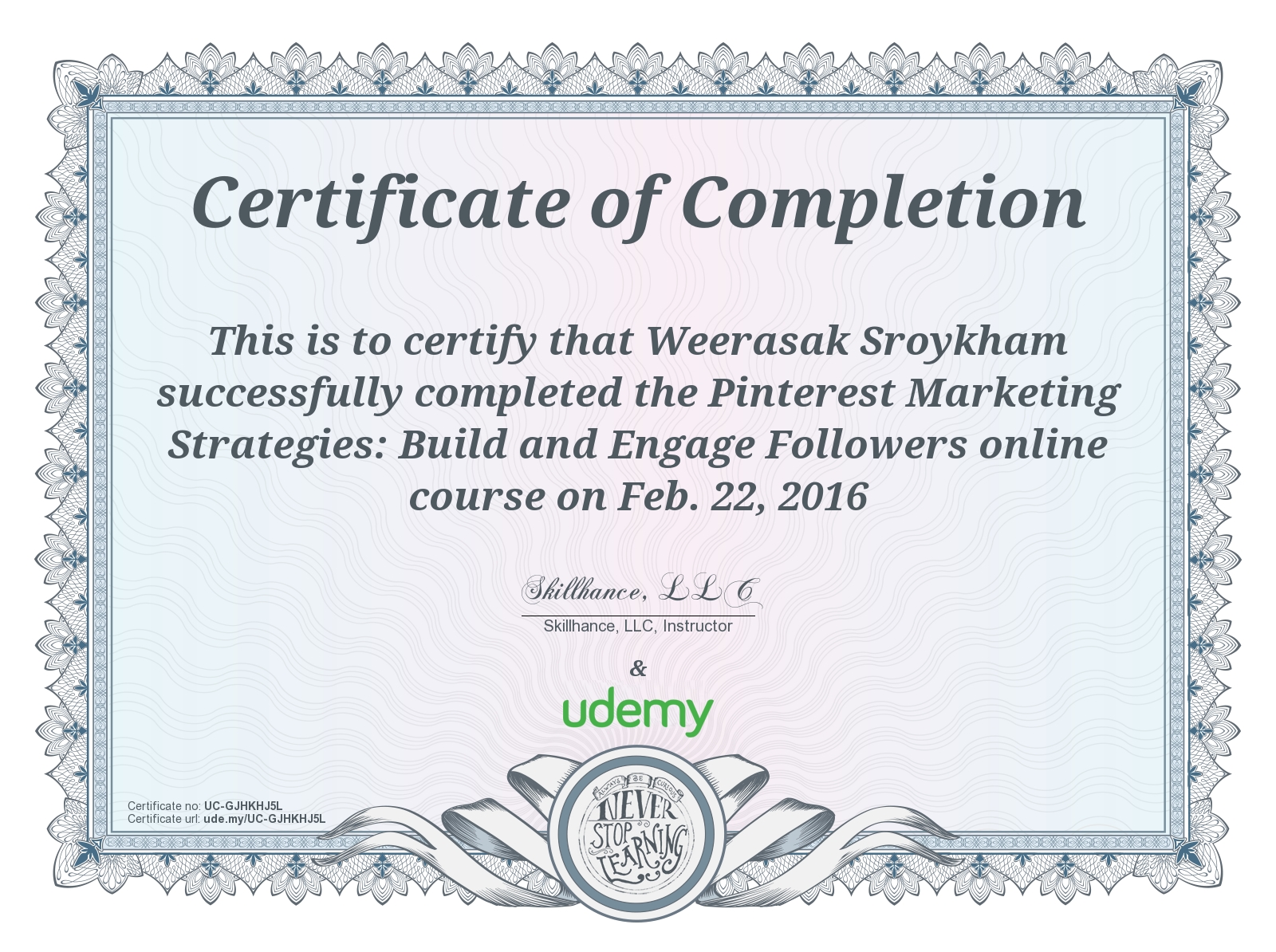 This certificate above verifies that Weerasak Sroykham successfully completed the course Pinterest Marketing Strategies: Build and Engage Followers on Feb. 22, 2016 as taught by Skillhance, LLC, Matt Bernstein on Udemy. The certificate indicates the entire course was completed as validated by the student.
