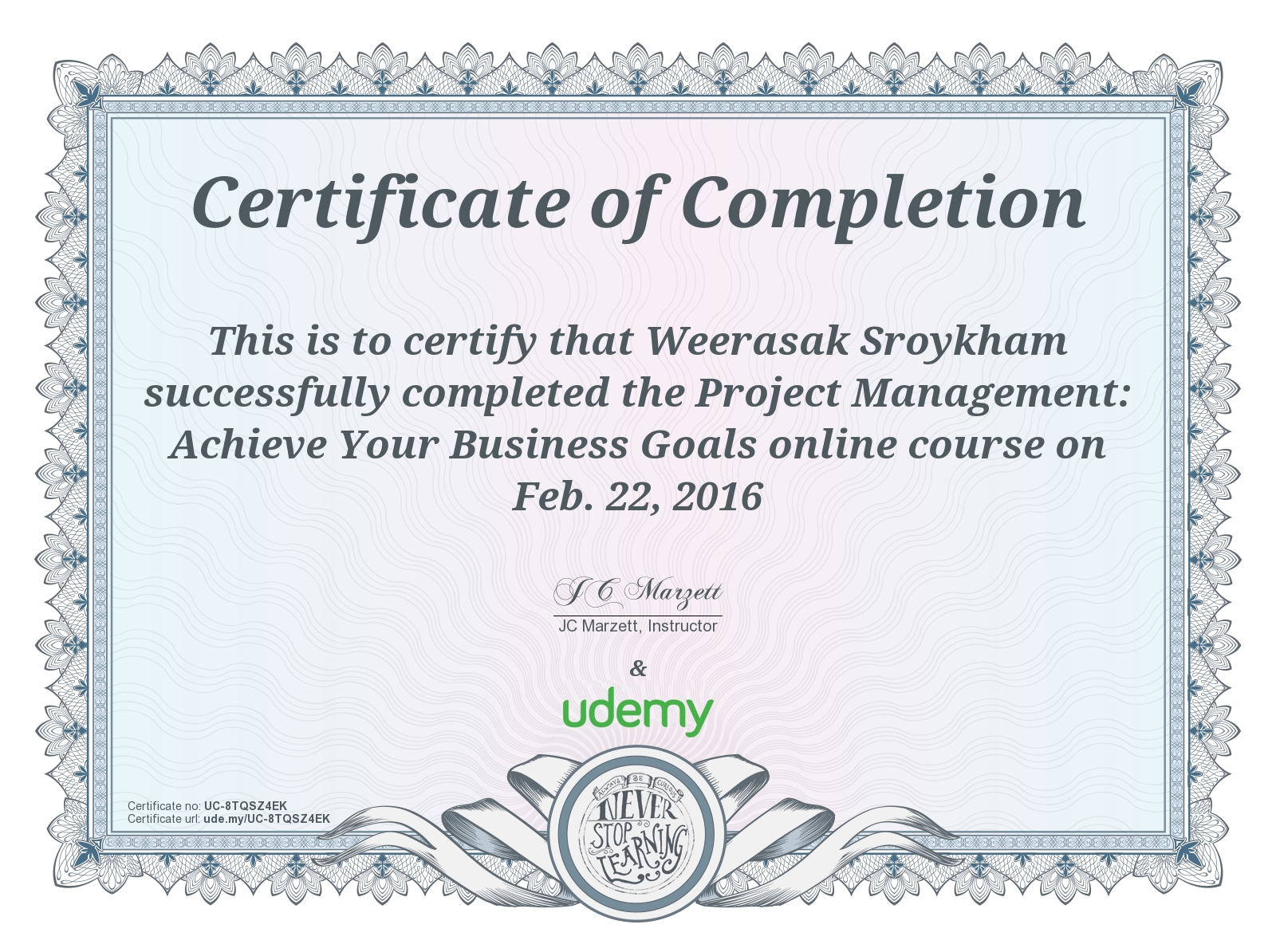 This certificate above verifies that Weerasak Sroykham successfully completed the course Project Management: Beyond the PMP Certification on Feb. 22, 2016 as taught by JC Marzett on Udemy. The certificate indicates the entire course was completed as validated by the student.