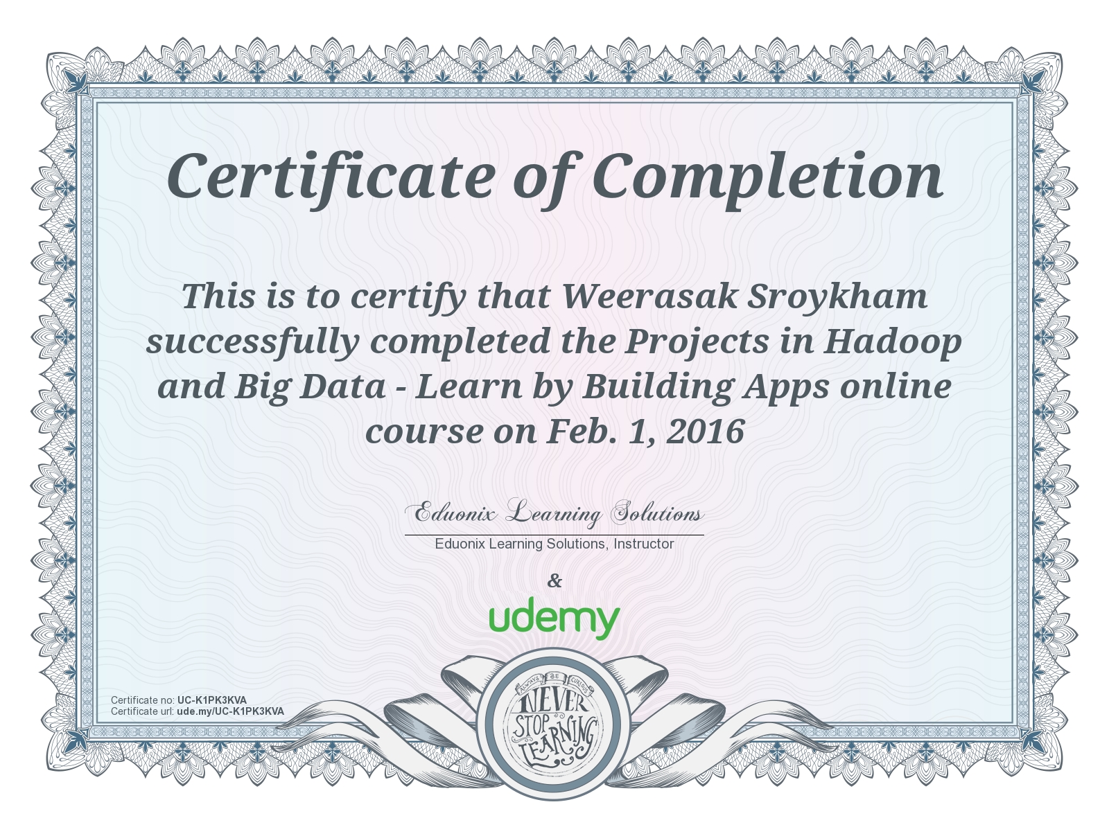 This certificate above verifies that Weerasak Sroykham successfully completed the course Projects in Hadoop and Big Data - Learn by Building Apps on Feb. 1, 2016 as taught by Eduonix Learning Solutions, Eduonix-Tech on Udemy. The certificate indicates the entire course was completed as validated by the student.