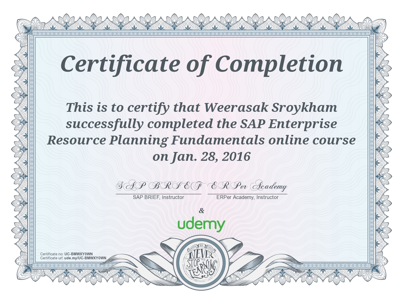 This certificate above verifies that Weerasak Sroykham successfully completed the course SAP Enterprise Resource Planning Fundamentals on Jan. 28, 2016 as taught by SAP BRIEF, ERPer Academy on Udemy. The certificate indicates the entire course was completed as validated by the student.