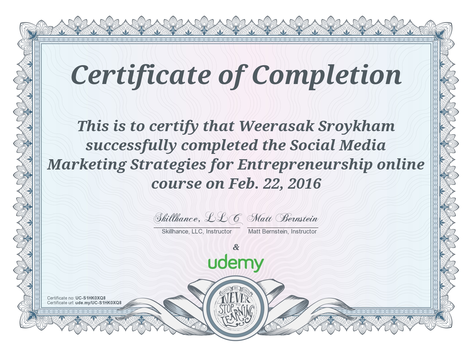 This certificate above verifies that Weerasak Sroykham successfully completed the course Social Media Marketing Strategies for Business Owners on Feb. 22, 2016 as taught by Skillhance, LLC, Matt Bernstein on Udemy. The certificate indicates the entire course was completed as validated by the student.