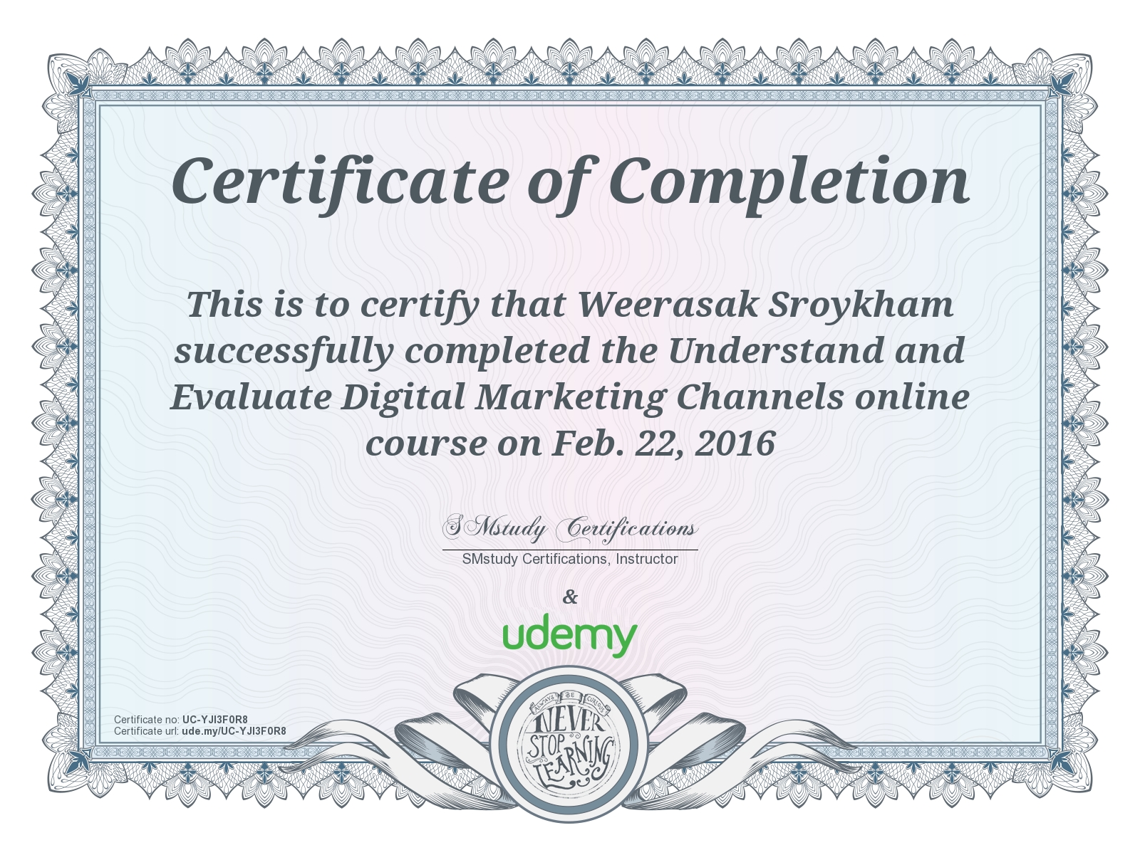This certificate above verifies that Weerasak Sroykham successfully completed the course Understand and Evaluate Digital Marketing Channels on Feb. 22, 2016 as taught by SMstudy Certifications on Udemy. The certificate indicates the entire course was completed as validated by the student.