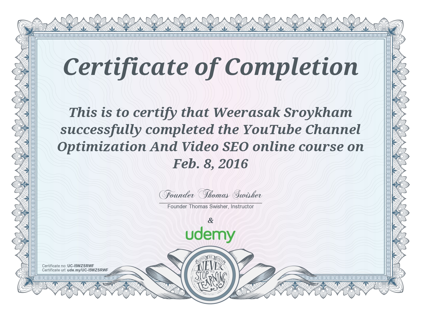 This certificate above verifies that Weerasak Sroykham successfully completed the course YouTube Channel Optimization And Video SEO on Feb. 8, 2016 as taught by Founder Thomas Swisher on Udemy. The certificate indicates the entire course was completed as validated by the student.